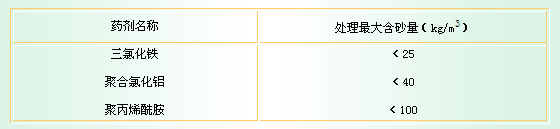 第4.1.1條 單獨投用各種凝聚劑能處理的最大含砂量可按表4.1.1規定采用。