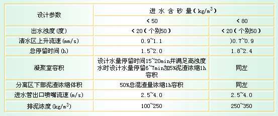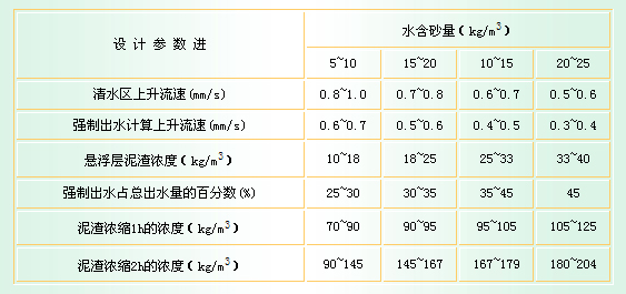 注:表中是使用三氯化鐵凝聚劑時的數據,若使用硫酸鋁時,上升流速降低一級,泥渣濃度降低10%。