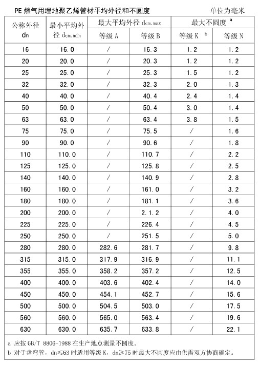 埋地燃氣用聚乙烯(PE)管材尺寸及公差: