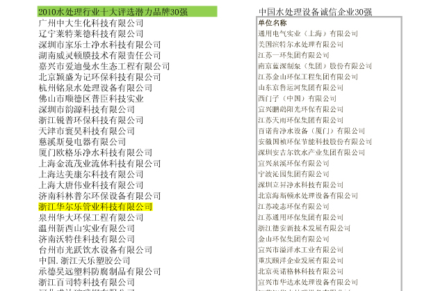 浙江華爾樂管業(yè)2010年被評為水處理十大評選潛力品牌行業(yè)30強